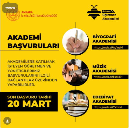 Kendini geliştirmek ve meslektaşlarıyla ortak ilgi alanlarında buluşmak isteyen tüm öğretmen ve idareciler, başvurularını 20 Mart 2026 tarihine kadar gerçekleştirebilecek. Başvurular, her akademi için özel olarak hazırlanan dijital linkler üzerinden (MEB.ai platformu) kolayca yapılabiliyor.