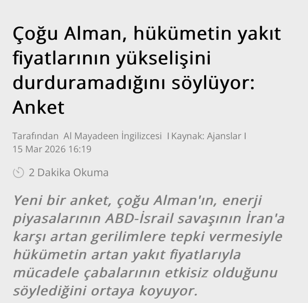 Savaşın Bedeli: Alman halkı, enerji fiyatlarındaki artışın "küresel bir arz-talep meselesi" olmadığını, aksine ABD ve İsrail’in İran’a karşı artan geriliminin bir yan etkisi olduğunu görüyor.