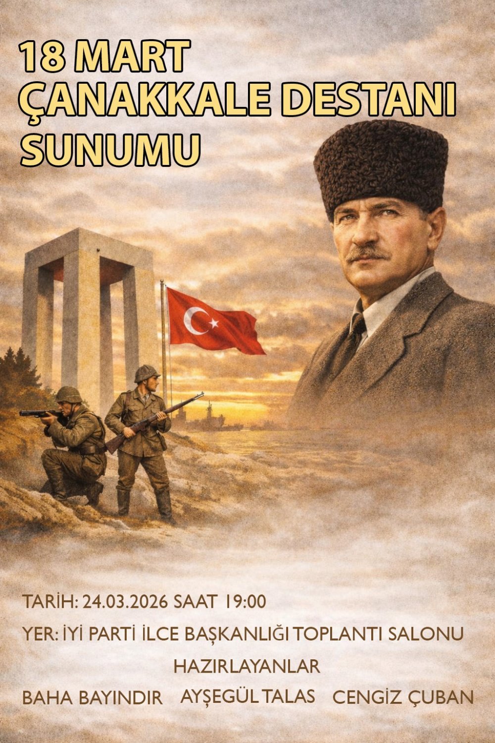 18 Mart Çanakkale Zaferi ve Şehitleri Anma Günü vesilesiyle İYİ Parti Etimesgut İlçe Başkanlığı anlamlı bir etkinliğe ev sahipliği yaptı. Etimesgut İlçe Başkanı Av. Mehmet Kılıç’ın öncülüğünde düzenlenen "Çanakkale Sunumu", partinin üst düzey yönetimini ve ilçe teşkilatını bir araya getirdi.