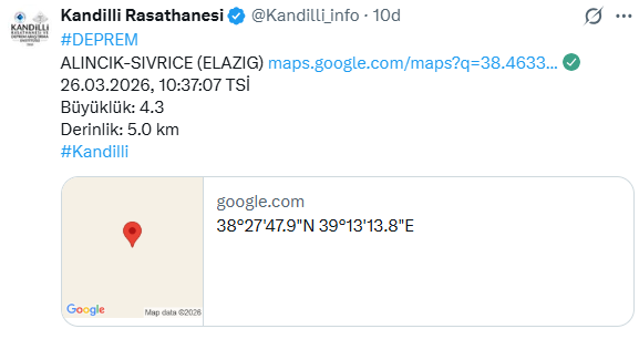 ELAZIĞ / SİVRİCE – Doğu Anadolu Fay Hattı üzerinde yer alan Elazığ, sabah saatlerinde meydana gelen sarsıntıyla kısa süreli bir panik yaşadı. Boğaziçi Üniversitesi Kandilli Rasathanesi ve Deprem Araştırma Enstitüsü'nün (KRDAE) anlık verilerine göre, merkez üssü Sivrice ilçesine bağlı Alıncık köyü olan 4.3 büyüklüğünde bir deprem kaydedildi.
