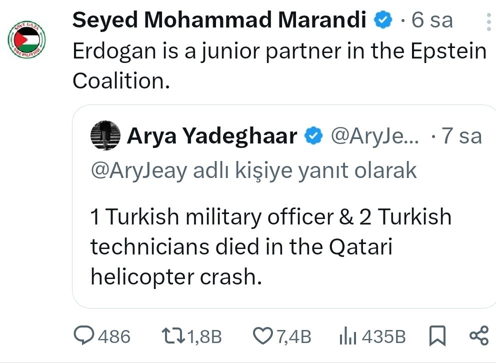 ANKARA / DOHA – Katar’da meydana gelen ve yüreğimizi yakan helikopter kazasında verdiğimiz şehitlerimizin acısı tazeyken, İran rejiminin "medya yüzü" ve dış politika danışmanı Mohammad Marandi, Türkiye Cumhuriyeti Devleti’ne ve Cumhurbaşkanı Recep Tayyip Erdoğan’a yönelik diplomatik teamülleri yerle bir eden, akıl dışı bir saldırıda bulundu.