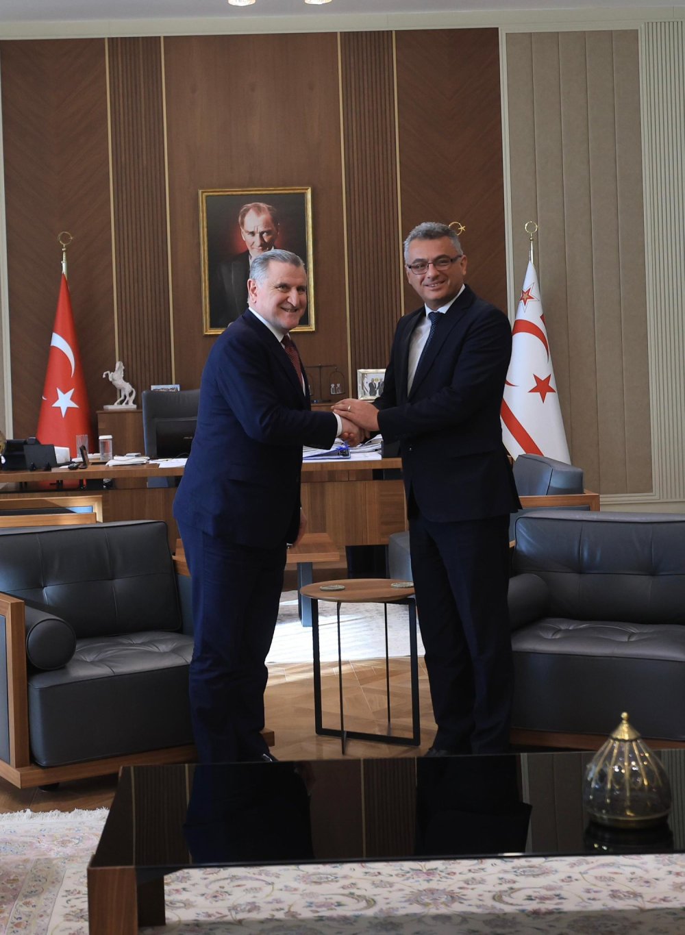 “Kuzey Kıbrıs Türk Cumhuriyeti Cumhurbaşkanı Sayın Tufan Erhürman’ı makamında ziyaret ettik. Sayın Cumhurbaşkanı ile yeni dönemde hayata geçireceğimiz ortak hedefler ve büyük ölçekli projeler üzerine kapsamlı bir istişare gerçekleştirdik. Nazik kabulleri ve gösterdikleri samimi misafirperverlik için kendilerine şükranlarımı sunuyorum.”